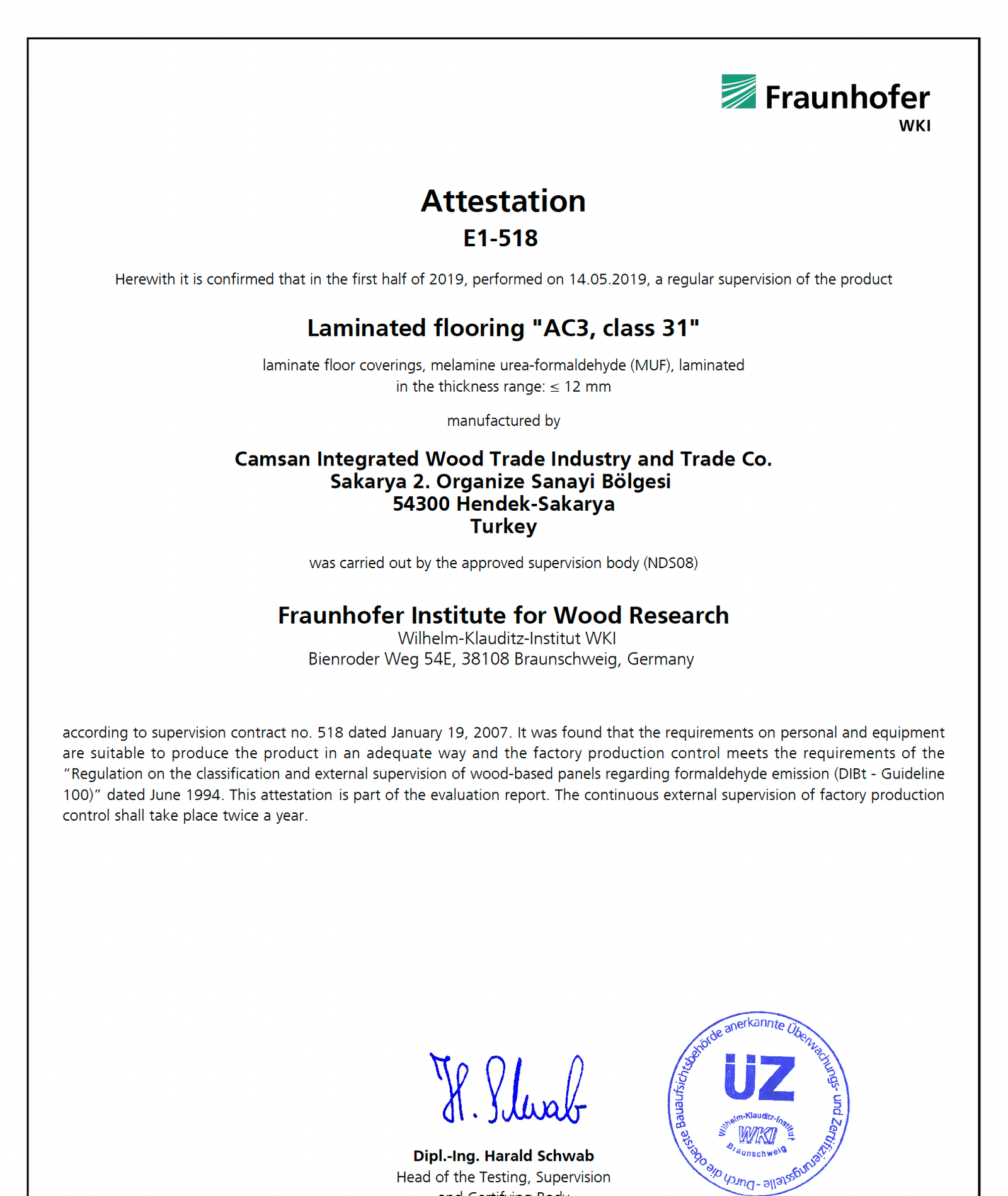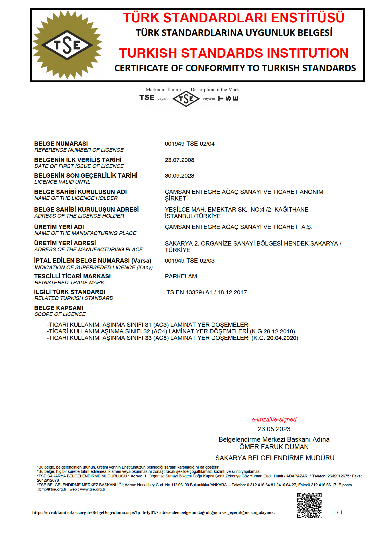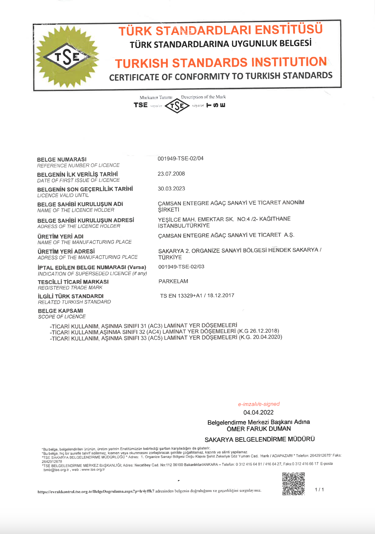 TS EN 13329+A2 PARKELAM Uygunluk Belgesi (AC3-AC4-AC5)