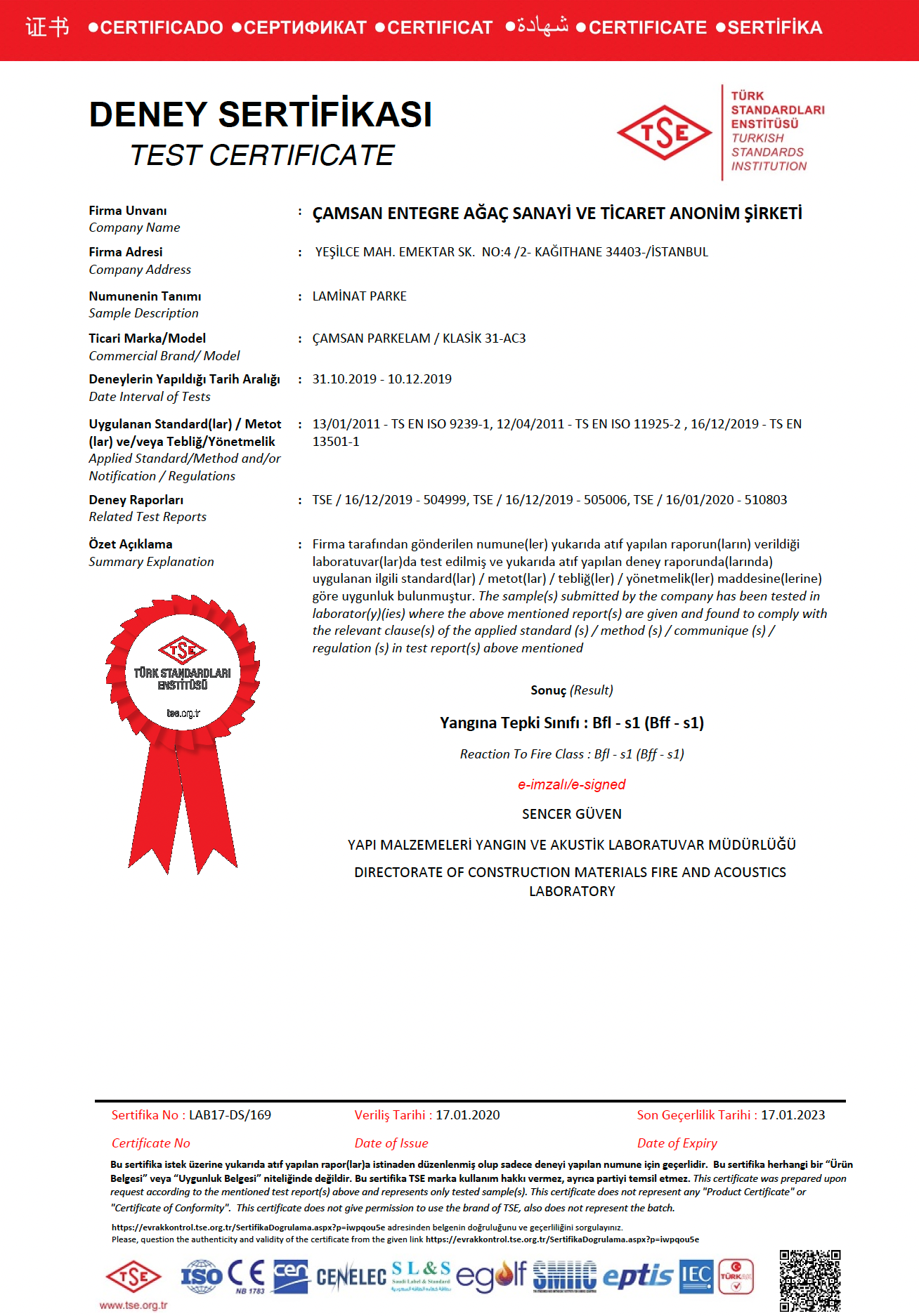 PARKELAM Yangına Tepki Sertifikası - Klasik AC3