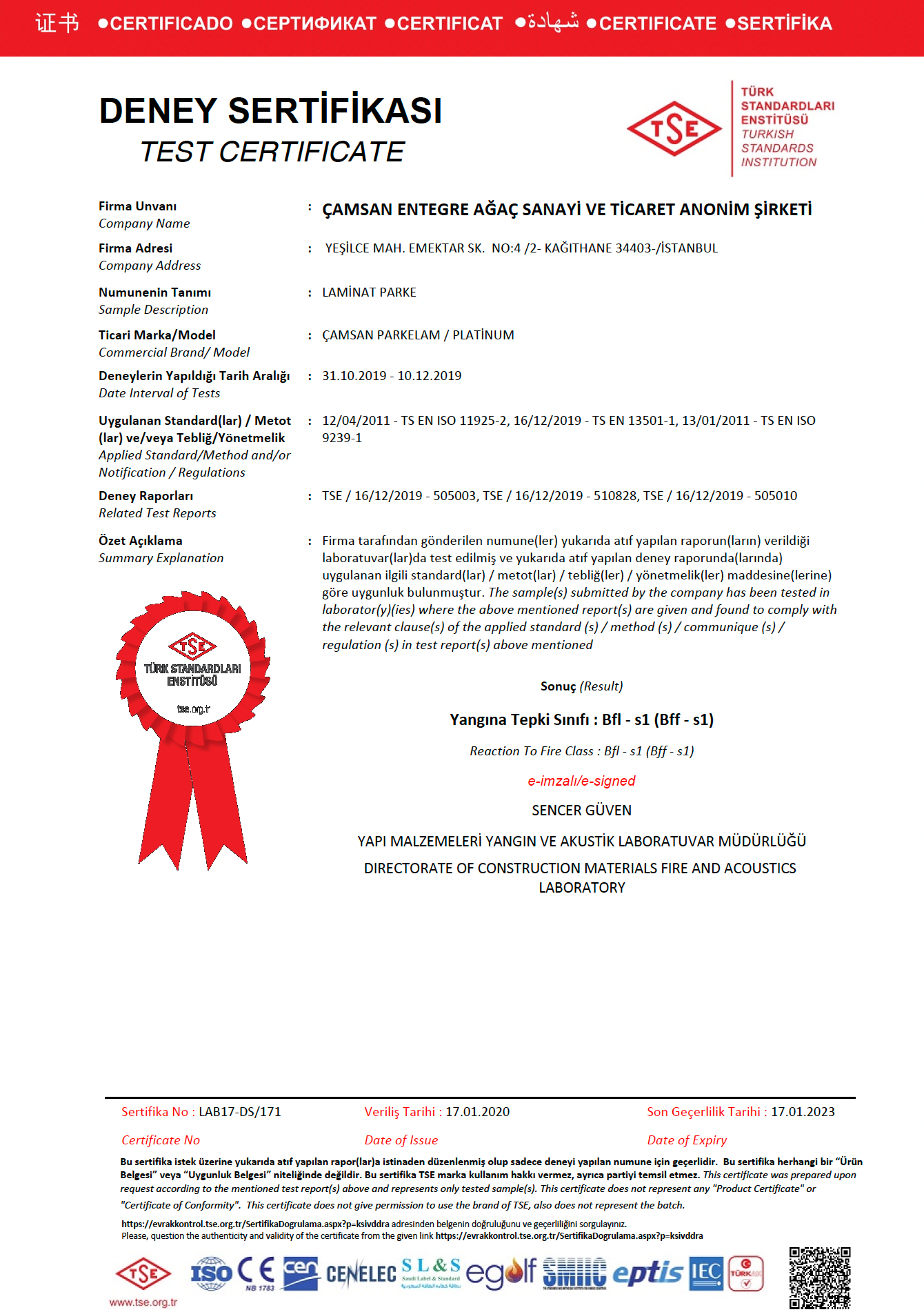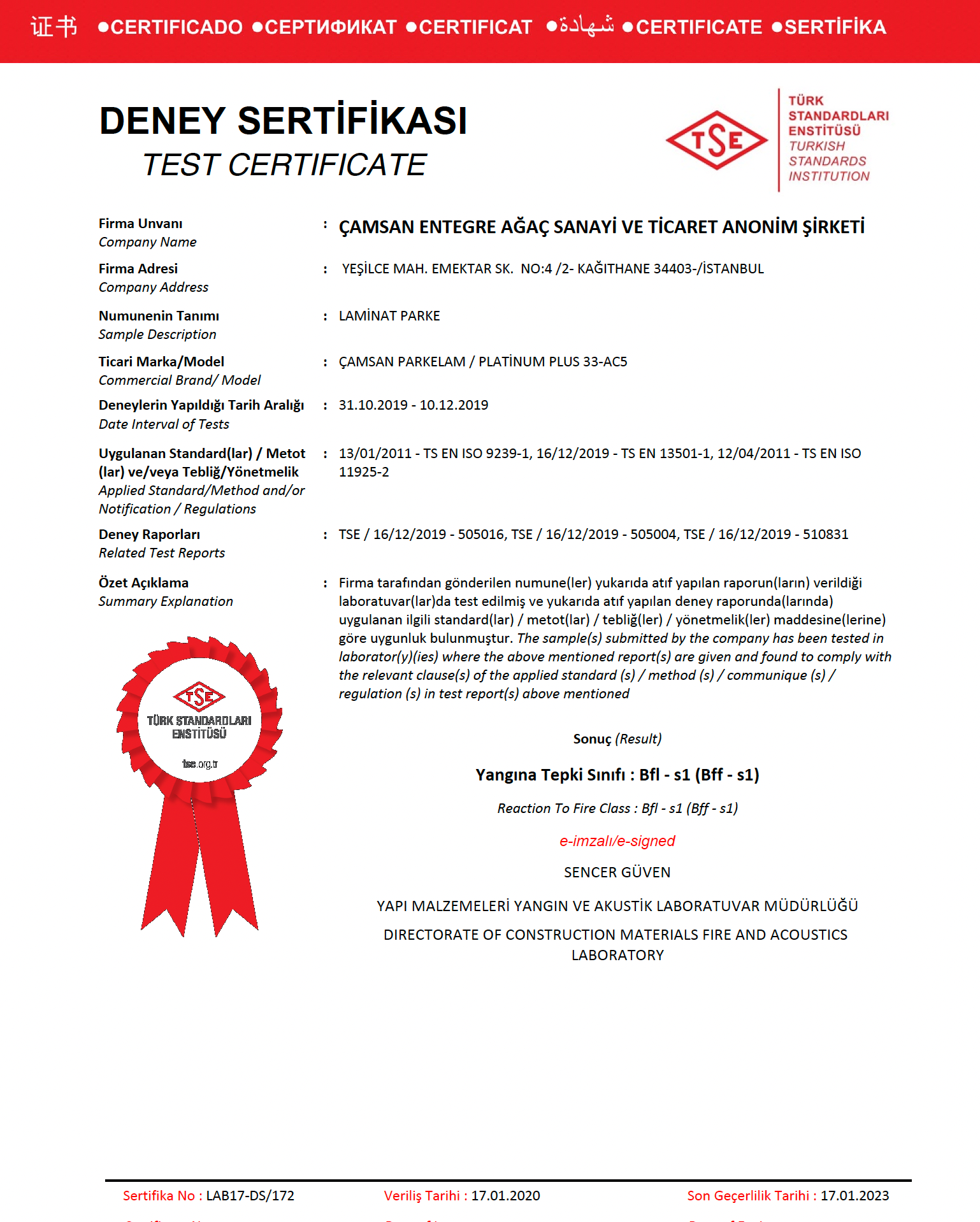 PARKELAM Yangına Tepki Sertifikası - Platinum Plus AC5
